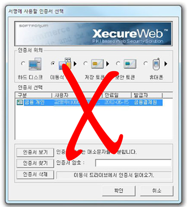 > 결국 인증서의 확보는 별도의 해킹이 아닌 단순한 '폴더 복사'로도 가능합니다. 인증서 복사를 C:\ProgramFiles\NPKI 폴더를 통째로 복사해서 사용해 보신 분들도 있으실 겁니다. 이로 인해 공격 대상자는 쉽게 인증서 입수를 하고 해당 인증서의 패스워드만을 크래킹 툴로 알아낼 위험이 높습니다.