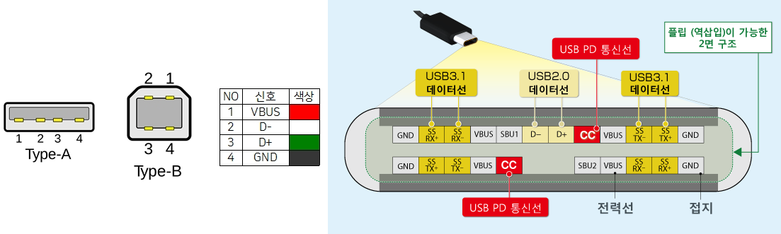 이는 기존 USB Type A 대비 회선수 증가에 따른 내용으로 디테일한 포트 구성은 아래와 같습니다.