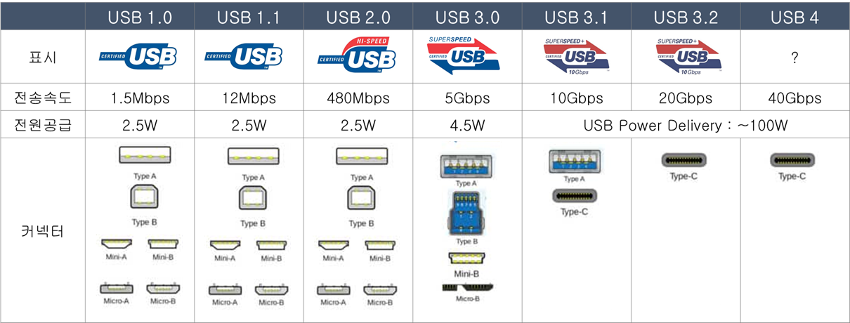 과거 USB 등장부터 현재까지 총 4번의 세대변경이 있었습니다. (근시일 내 USB 4.0의 신규격이 발표될 예정입니다)