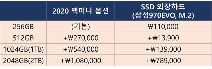 앞선 "2020 맥미니, 사고싶다고 덜컥 사버리면 큰일!" 글에서도 설명드렸듯, SSD 내장 저장장치는 상당히 고가이며 특히 애플의 경우 기존 시장가 대비 상상을 초월하는 가(악!)성비를 보여줍니다.